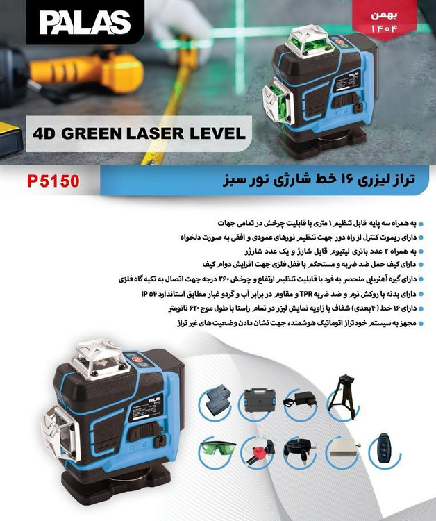 تراز لیزری پالاس مدل P5150 ۱۶ خط ۴ بعدی ۳۶۰ درجه نور سبز